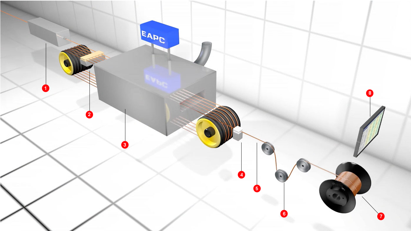 All enamelled wires are enamelled on special enamelling machines which are developed and produced by ELEKTRISOLA for our exclusive use. Enamelling of enamelled wire is a continuous process, mainly consisting of the annealing process, enamel application, curing process, lubricant application, tension control and spooling.