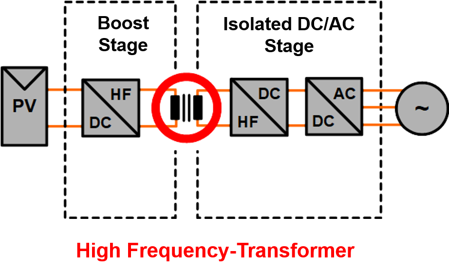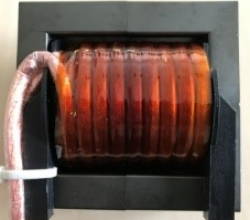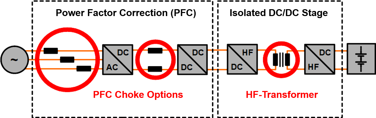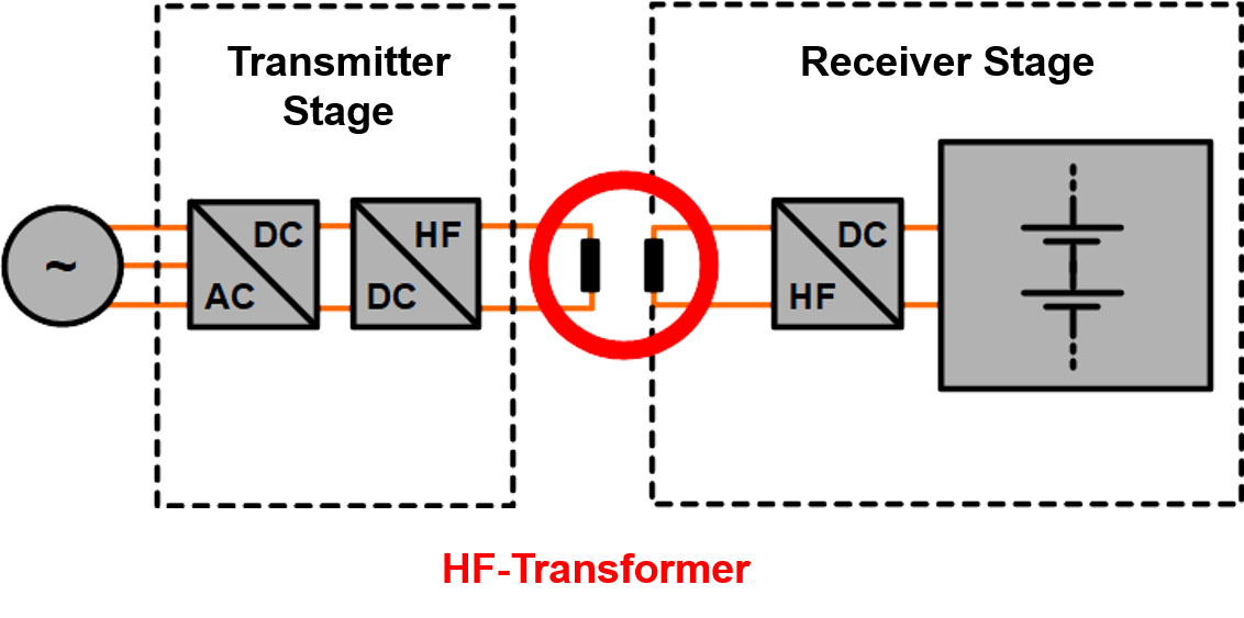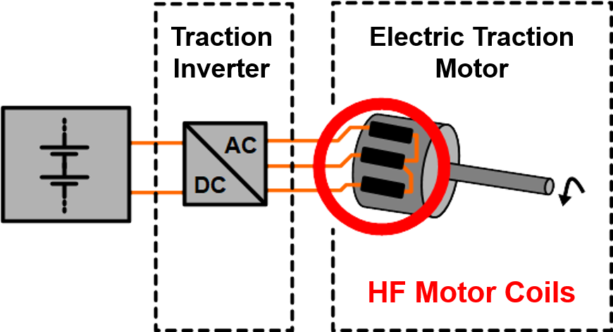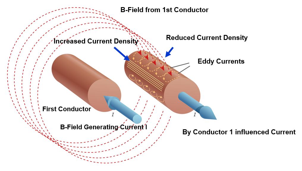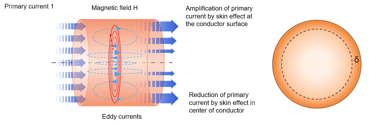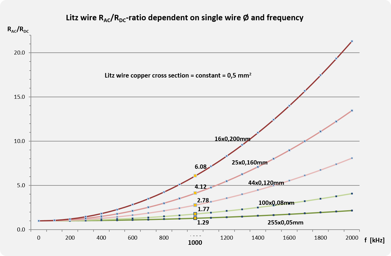 In the coils, which are the magnetic energy storage of the application, eddy current losses occur due to the high frequencies. Eddy current losses increase with the frequency of the current. The root of these losses is the skin effect and proximity effect, which can be reduced by using high frequency litz wire. The magnetic field which causes these effects is compen-sated for by the twisted bunching con-struction of the litz wire.