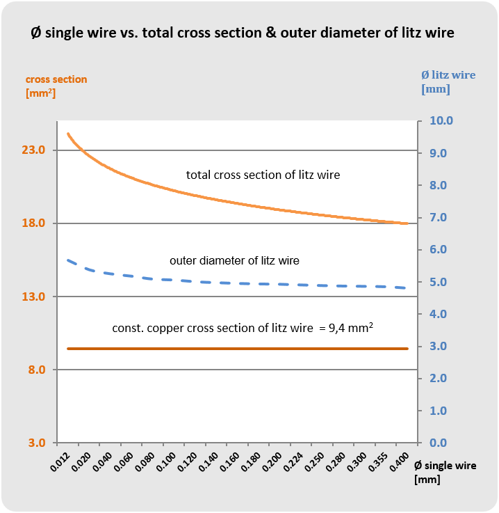 The following graphics show this relationship by means of a litz wire with constant copper cross section and several single wires of different diameter.
