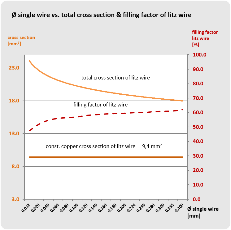 The graphic “Relationship of single wire, litz cross section and filling factor” illustrates the reduction of copper filling factor with rising nominal diameter of single wire.
