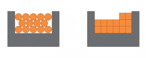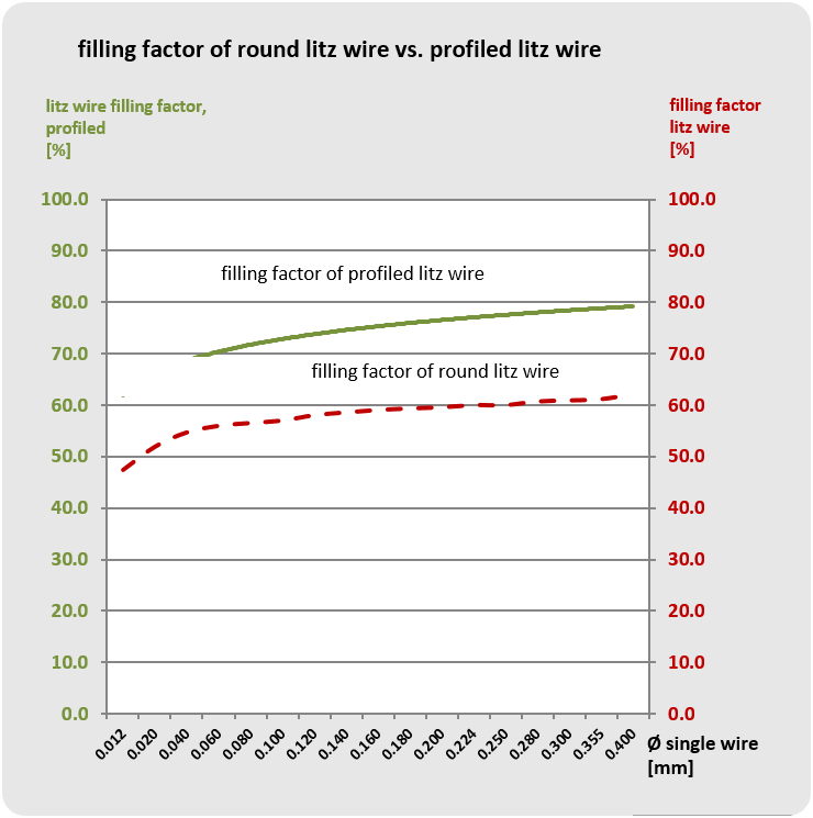 By rolling round shaped litz wires to square profiles the filling factor can be further increased, see graphic “Comparison of filling factor of round and profiled litz”, green line.