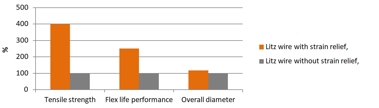 Some of the ultrafine litz wires are impacted by high mechanical forces during further processing and over their lifetime. Litz wire constructions starting from an available single conductor diameter of 0.01 mm (AWG 58) can be designed implementing strain reliefs to improve the resistivity of the litz wire against tensile stress. It is typically used in applications where litz wire is used not wound in a coil, but used like a cable.