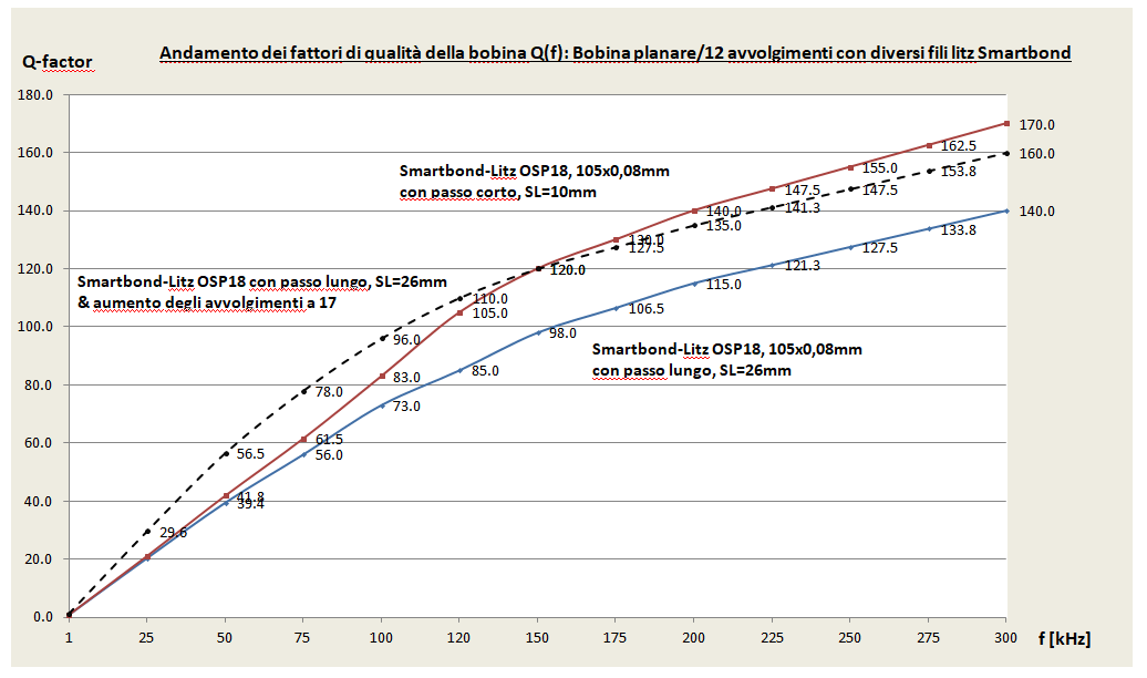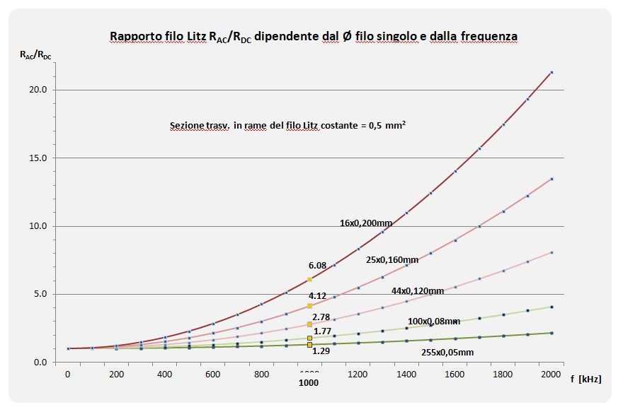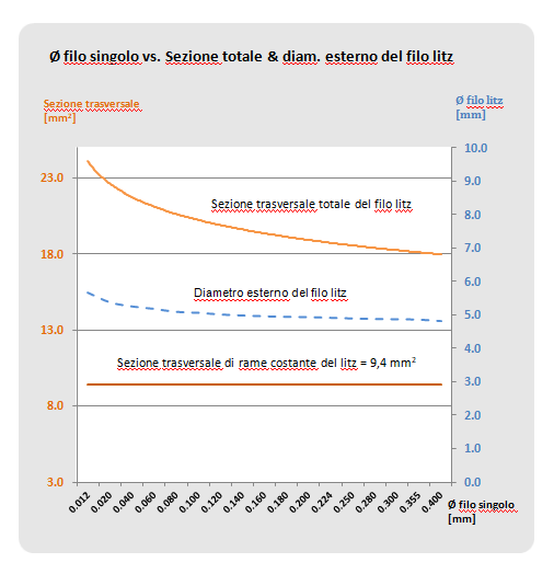 I grafici seguenti mostrano questa relazione tra un filo litz con sezione trasversale di rame costante e più fili singoli di diverso diametro.