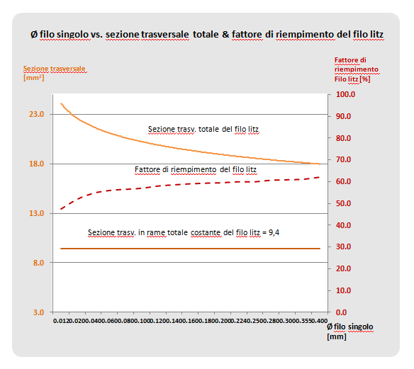Il grafico “Rapporto tra singolo filo, area di sezione del litz e fattore di riempimento” illustra la riduzione del fattore di riempimento del rame all'aumentare del diametro nominale del singolo filo.