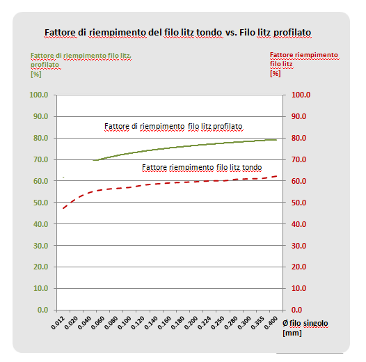 Avvolgendo fili litz di forma tonda su profili quadrati, il fattore di riempimento può essere ulteriormente aumentato, vedasi la linea verde del grafico “Confronto tra fattori di riempimento tra fili litz tondi e profilati”.