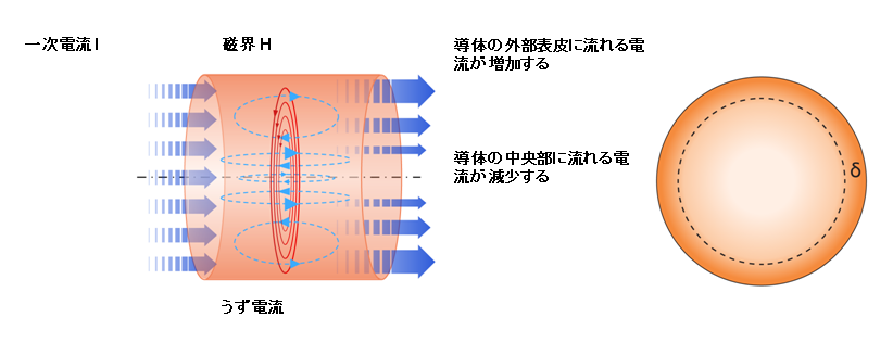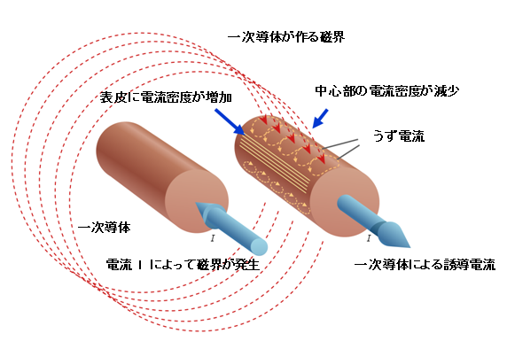 周波数を上げると電流は導体表面側を流れようとするため、測定される交流抵抗 X(RACとも表示)は、直流抵抗 R (RDCとも表示) と比べ上昇する。抵抗値の増加、つまり交流抵抗上昇による抵抗損は、高周波領域で直流抵抗損失を超える。