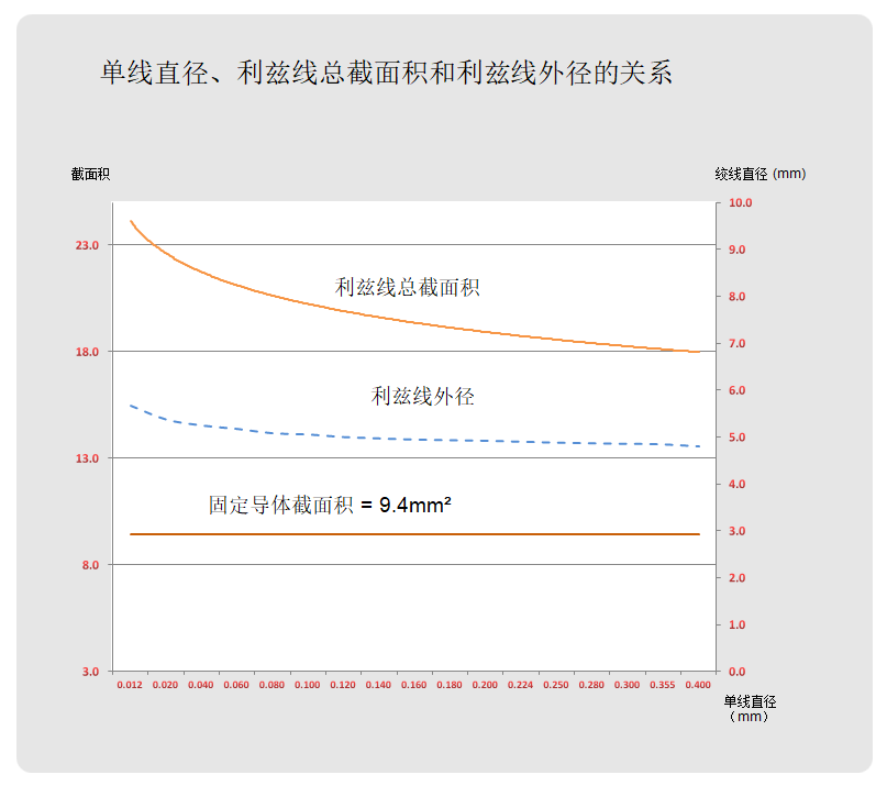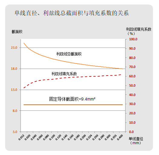 如果利兹线外径固定不变,填充系数也会因单线直径变细而减小。因此这时导体截面积会随之减小。