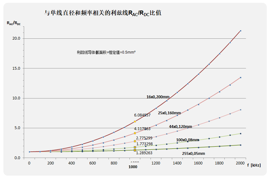 高频损耗由各种损耗因素的累积影响,以及利兹线应用的工作条件所决定。因此无法用一个简单的公式进行计算,必须依靠对应用的深入理解和一些额外的工具。